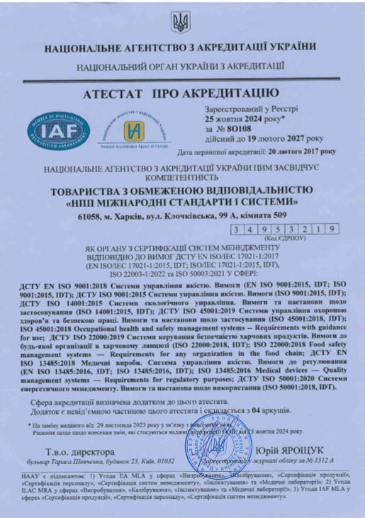 ТОВ “НПП МІЖНАРОДНІ СТАНДАРТИ І СИСТЕМИ” призначено органом з оцінки відповідності для виконання як третьою стороною певних завдань з оцінки відповідності, визначених у Технічному регламенті безпеки інфраструктури залізничного транспорту, затвердженого постановою Кабінету Міністрів України від 11.07.2013 р. №494 (з урахуванням змін, унесених постановою Кабінету Міністрів України від 26 січня 2022 р. №53), і йому присвоєно ідентифікаційний номер UA.TR.060